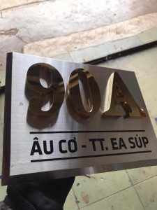 Làm biển số nhà với chất liệu inox là khắc chìm bằng Laser, dùng công nghệ ăn mòn bề mặt.